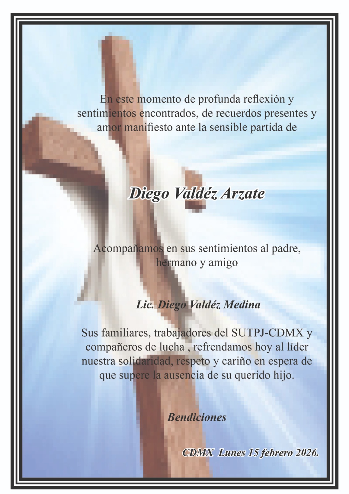 El periódico digital Minuto a Minuto da a conocer las condolencias de familiares, trabajadores y amigos al Secretario General del SUTPJ-CDMX, Lic. Diego Valdéz Medina, ante el sensible fallecimiento de su querido hijo, Diego Valdéz Arzate.