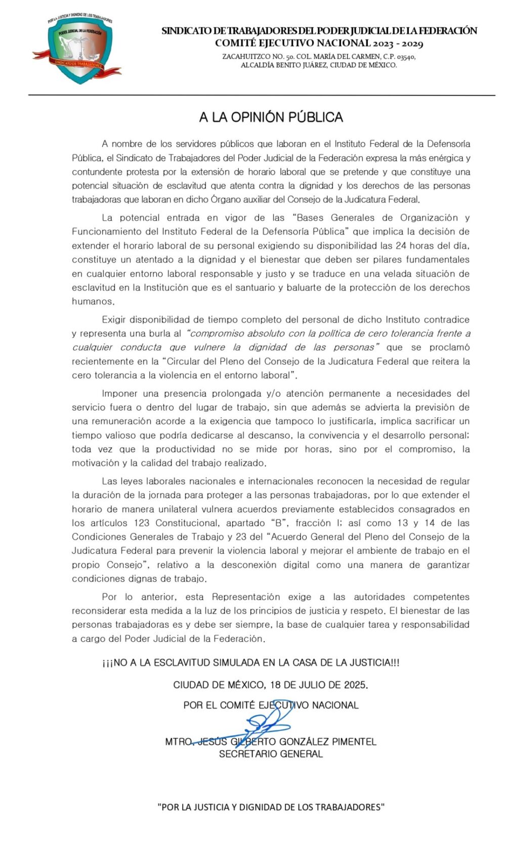 A nombre de los servidores públicos que laboran en el Instituto Federal de la Defensoría Pública, el Sindicato de Trabajadores del Poder Judicial de la Federación expresa la más enérgica y contundente protesta por la extensión de horario laboral que se pretende y que constituye una potencial situación de esclavitud que atenta contra la dignidad y los derechos de las personas trabajadoras que laboran en dicho Órgano auxiliar del Consejo de la Judicatura Federal.