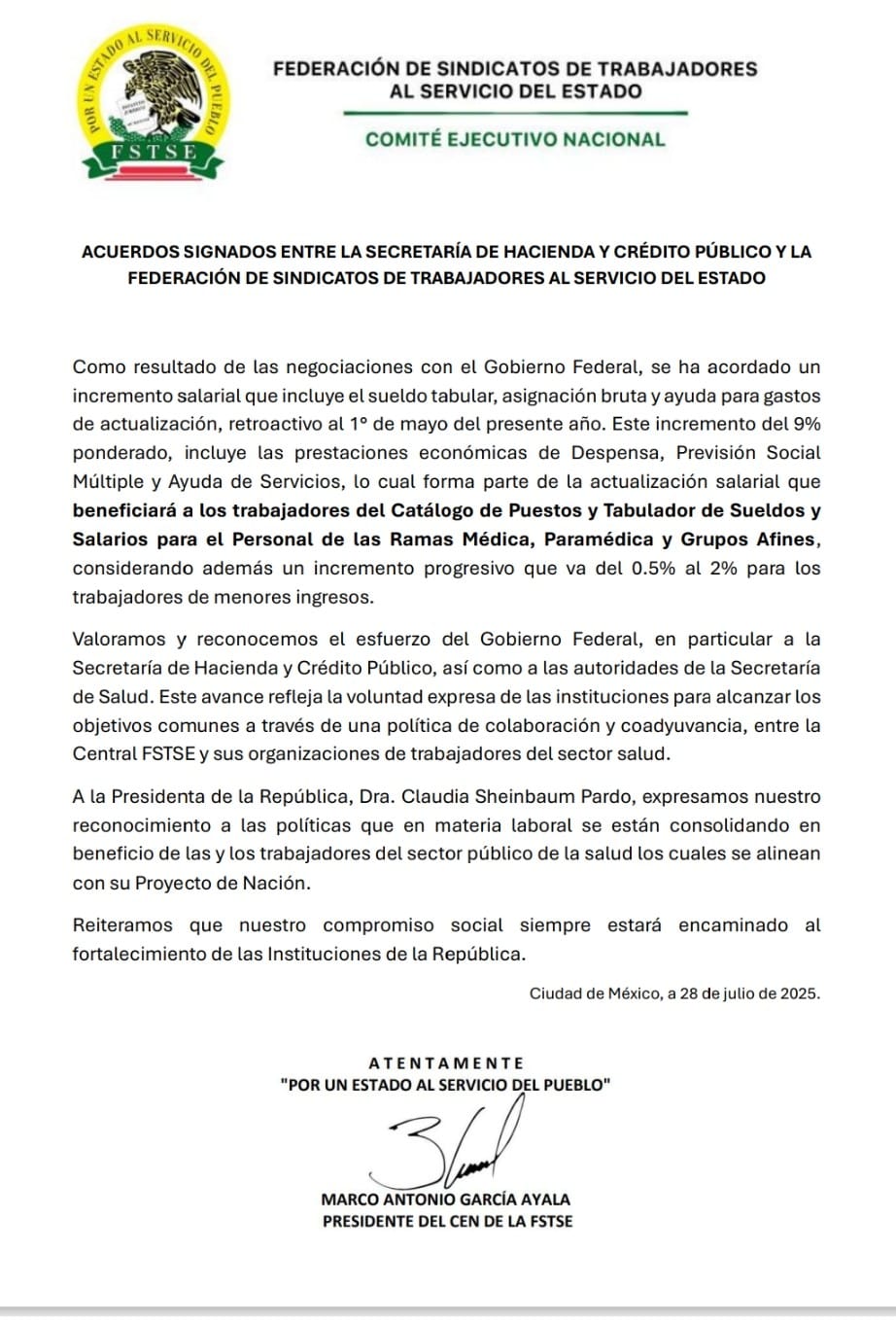 Fue acordado un incremento salarial del 9 por ciento ponderado para los trabajadores del sector salud de la rama médica, paramédica y grupos afines en el gobierno mexicano, informó este 1 de agosto de 2025 el presidente de la Federación de Sindicatos de Trabajadores al Servicio del Estado (FSTSE), Marco Antonio García Ayala.