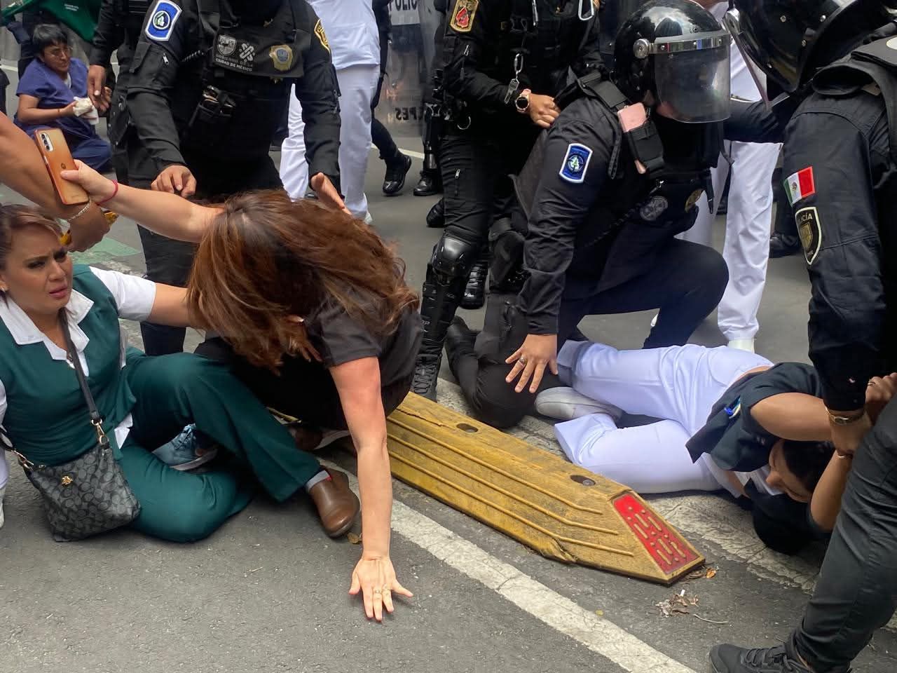 Trabajadoras de Salud, pertenecientes al IMSS Bienestar en la Ciudad de México, fueron desalojadas violentamente esta tarde por policías que sin razón alguna a golpes y arrastrándolas, las obligaron a retirarse de las inmediaciones del edificio, ubicado en Insurgente Sur 1940, donde se encuentra la sede de esa institución.