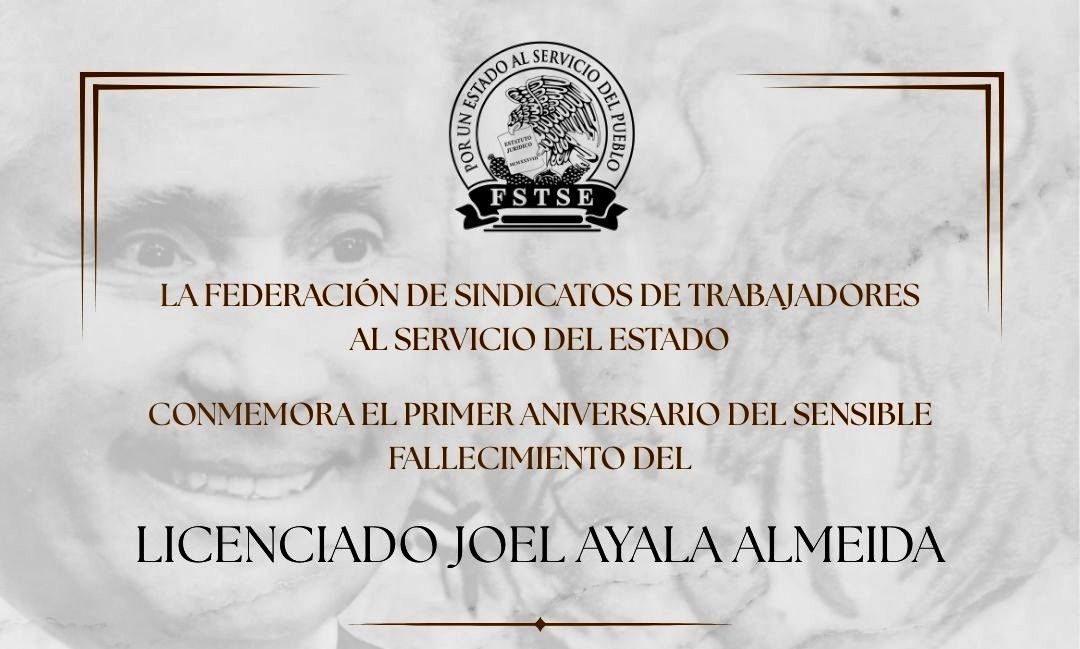 En un mensaje a través de sus redes sociales, la Central FSTSE que preside Marco Antonio García Ayala, cita que la vida y trayectoria del Licenciado Joel Ayala Almeida, fueron trascendentes en la historia del sindicalismo en México.