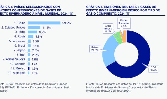A nivel mundial, México se encuentra en el lugar 11 entre los países que más emiten gases de efecto invernadero a la atmósfera, según un reporte dado a conocer este 15 de diciembre de 2025 por el área de Estudios Económicos de BBVA México.