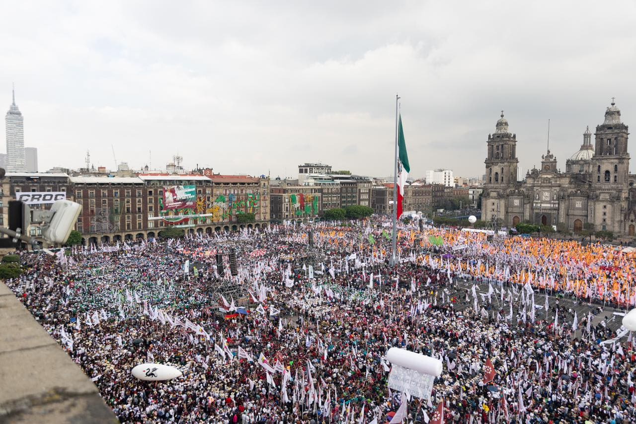 Contingentes de trabajadores del Sindicato Ferrocarrilero, de la Federación de Agrupaciones Obreras, de la FSTSE, del SNTISSSTE, de la CTM, CROC, CROM, SNTE y COR entre muchas otras organizaciones, llenaron la Plaza de la Constitución desde muy temprano.